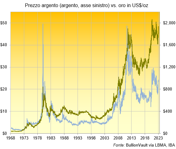 I prezzi dell'oro e dell'argento tendono a muoversi insieme e dal 1968 i due metalli hanno un valore di correlazione molto vicino, pari a 0,63 (1,0 è una correlazione perfetta). Tuttavia, i prezzi dell'argento sono più volatili. Per ogni 1% di variazione dell'oro, in aumento o in diminuzione, l'argento si muove in media del 3%.