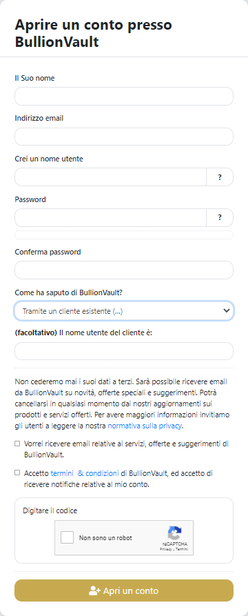 Diventare un affiliato è molto semplice. La prima cosa da fare è andare sul sito https://oro.bullionvault.it ed effettuare una registrazione. Sarà necessario convalidare il vostro conto per poter prelevare i vostri proventi.
