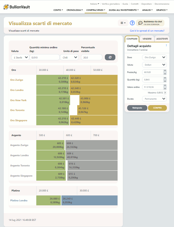 È possibile comprare metallo o venderlo direttamente dal pannello degli ordini. Se il luogo di custodia del metallo è indifferente per il cliente, da quest'ultima sezione è possibile acquistarlo dove si origina la migliore offerta. Questa schermata permette al cliente di sfruttare immediatamente le offerte vantaggiose che si possono presentare.